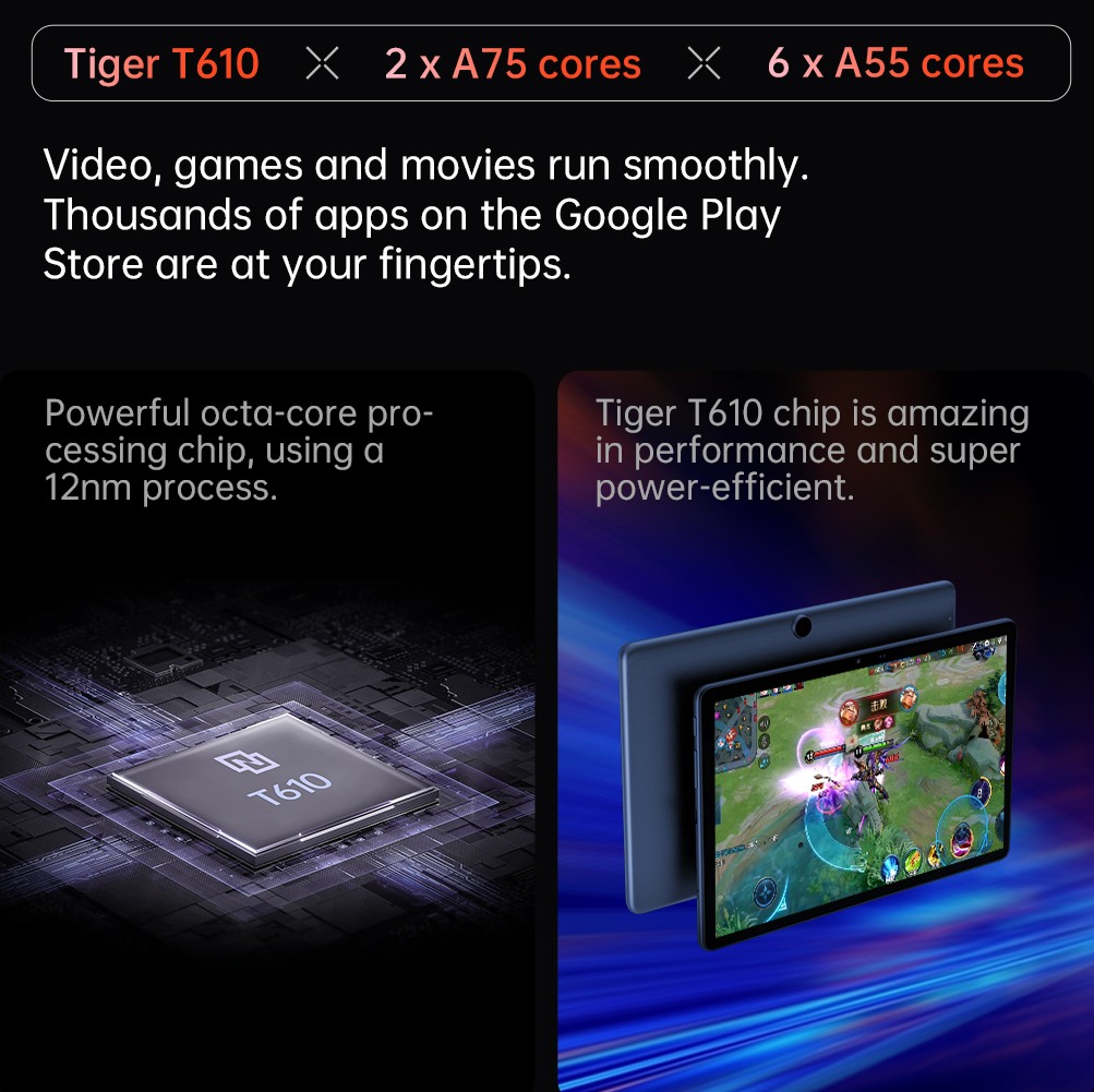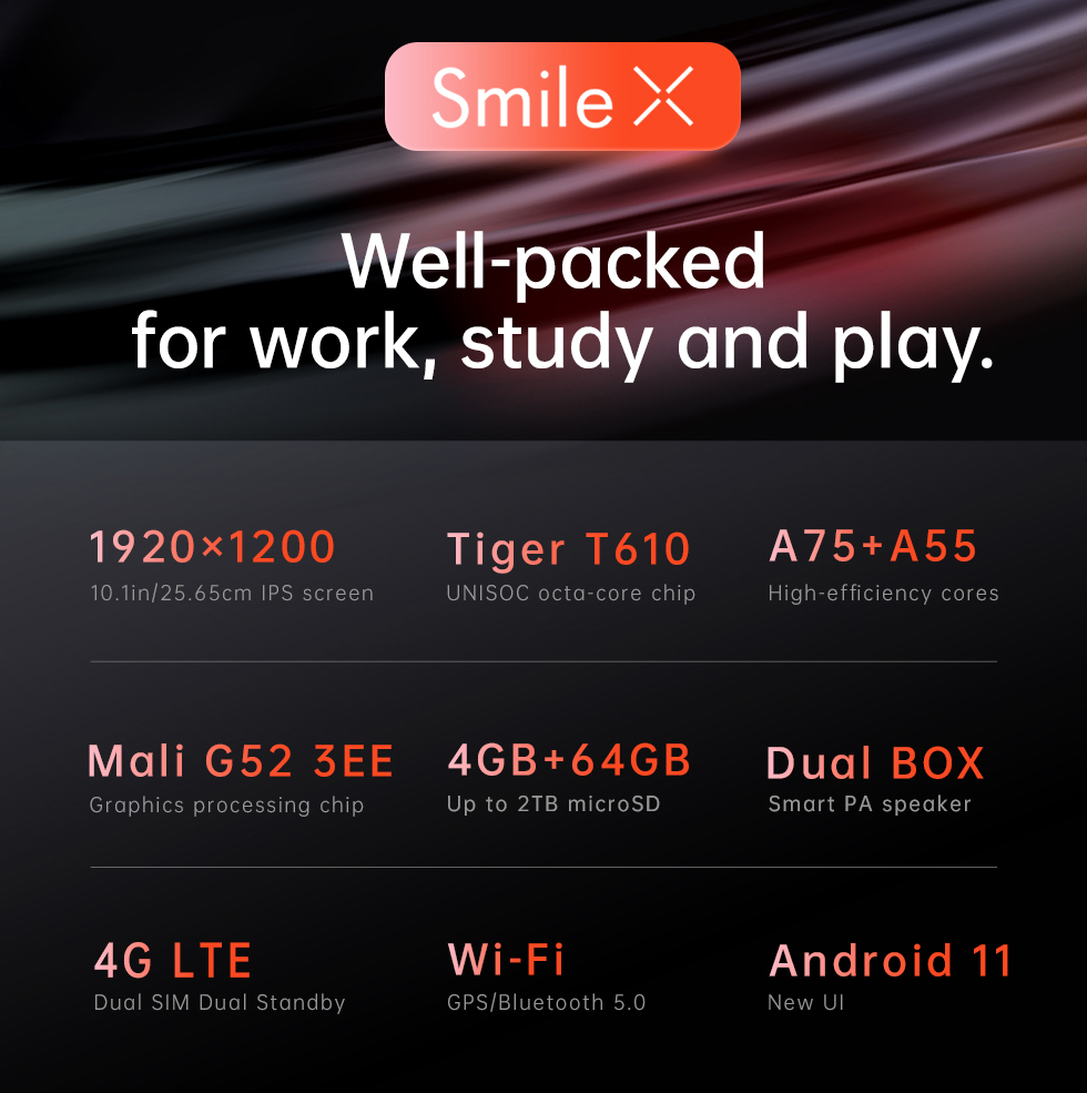 Smile X adopts with 8-core UNISOC Tiger T610 chipset and Mali G52 GPU. The super-fast 12nm processor uses two high-performance A-75 cores and six high-efficiency A-55 cores, maximizing power and battery life. Make the video, games and movies run smoothly. Thanks to the 850Mhz graphics processor, thousands of apps and tools on the Google Play Store are at your fingertips.