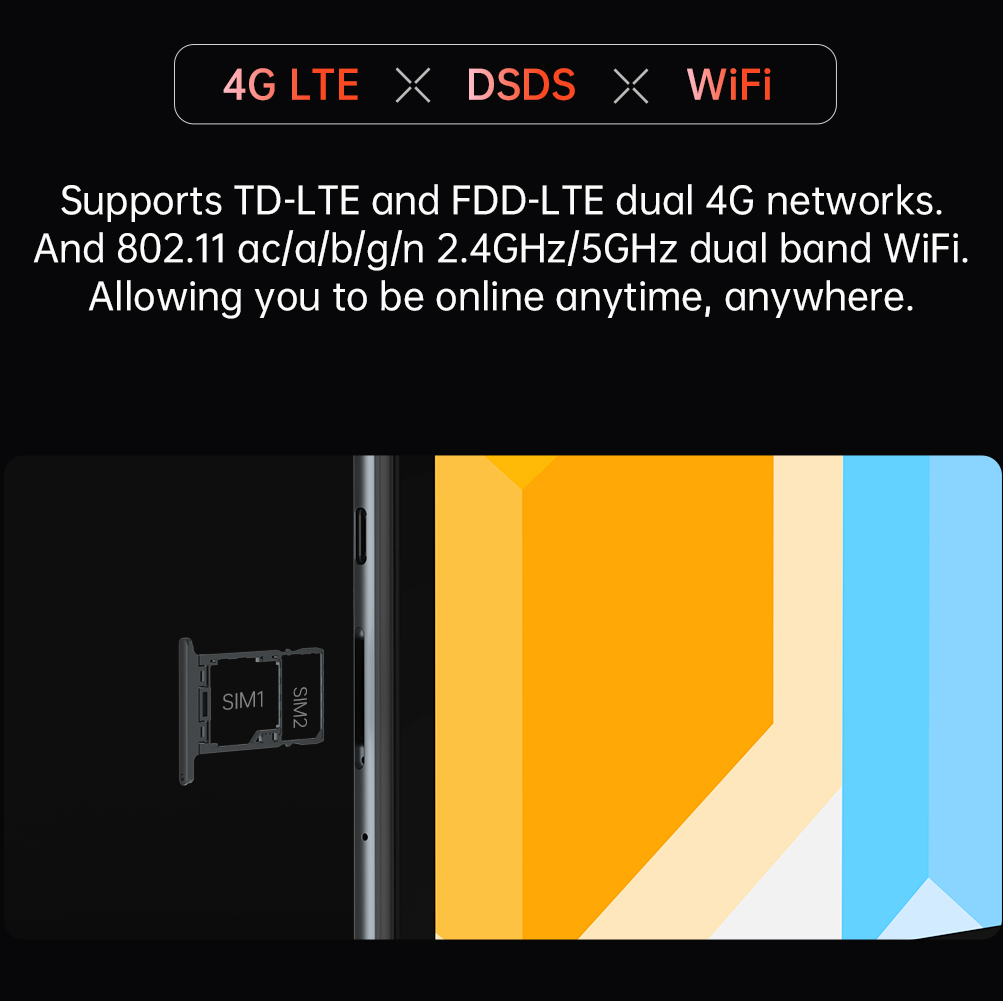 Dual SIM dual standby, unblocked connection at any time. Alldocube Smile X supports TD-LTE and FDD-LTE dual 4G networks, adopts a three-select two-card tray, supports dual-card dual-standby, allowing you to be online anytime, any- where, and enjoy the fun of mobile Internet.