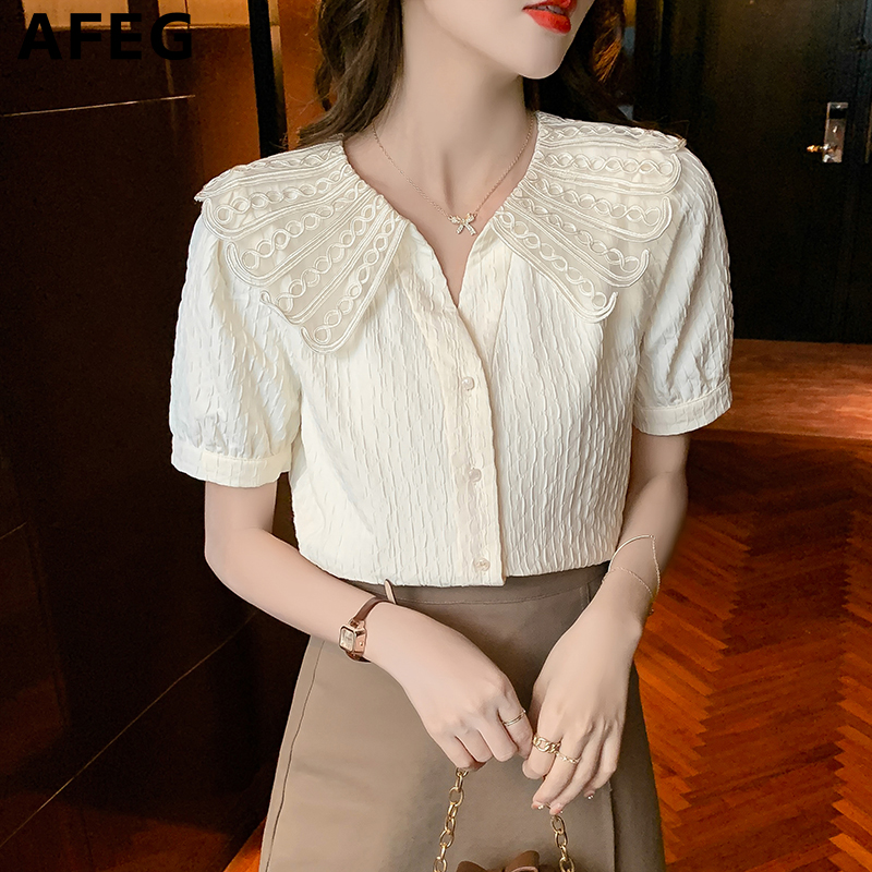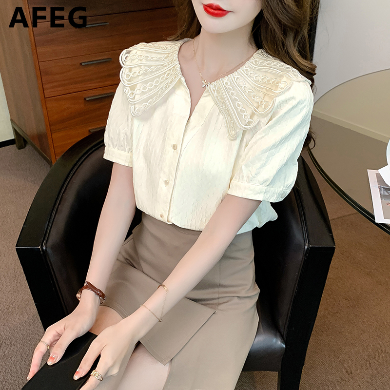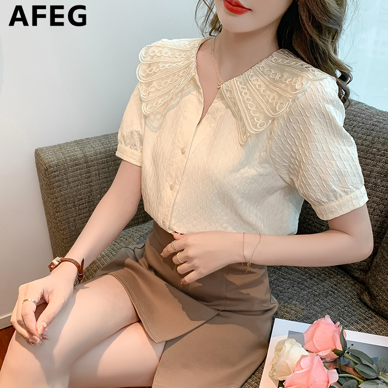 AFEG new Korean style fashion loose all-match chiffon stitching lace short-sleeved blouse for women