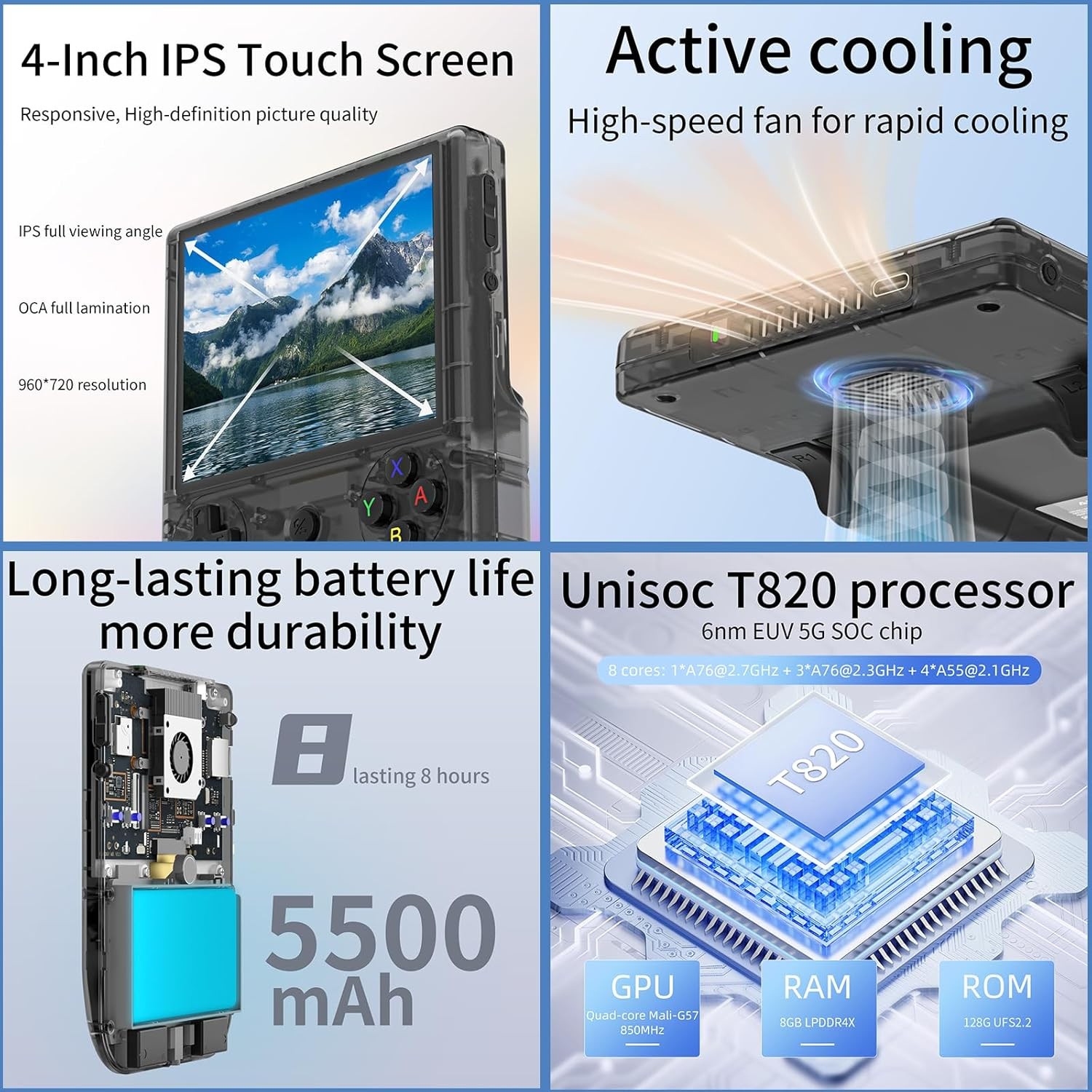 • RG406V Upgrade Technology and Performance: The Anbernik RG 406V uses an Unisoc T820 processor, an 8-core 6nm EUV 5G SOC chip, combined with a quad-core Mali-G57 operating frequency of 850Mhz to deliver high performance with lower power consumption. With 8GB of LPDDR4X RAM and 128GB of UFS2.2 storage, the rg406v offers plenty of room for your games and apps. Run on Android 13 for a smooth and up-to-date user experience.