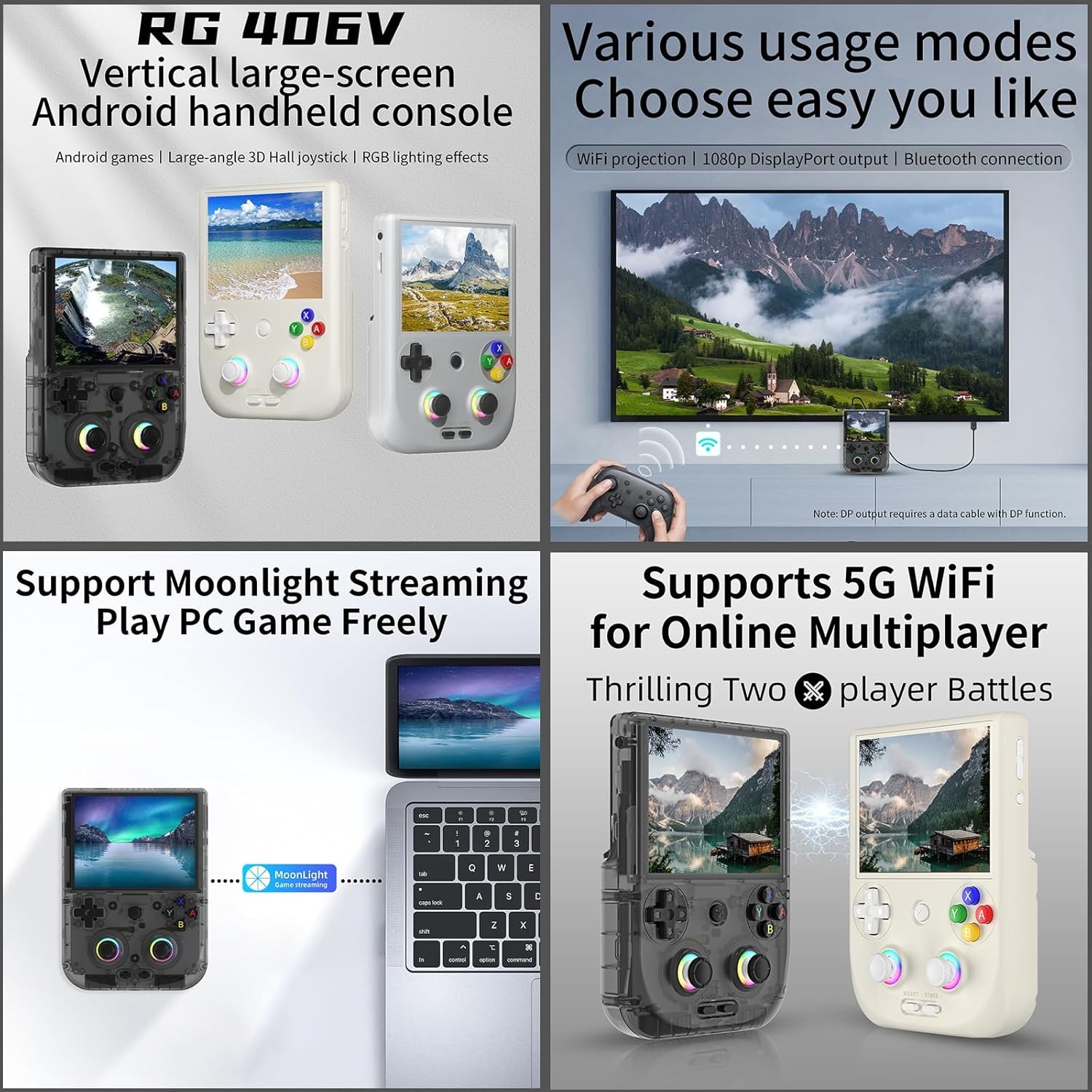 • The rg406 v supports Wireless Screen Casting-Imagine playing your favorite games on the big screen—this console has you covered with wireless screen casting! Simply sync it to your TV, grab your Bluetooth controller, and experience multiplayer action right from your couch. It is suitable for carrying aroundis a great for boyfriend, husband, brother, son, father and friends for birthday, Father's Day, Christmas, Valentines Day, Thanksgiving Day etc.